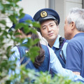 6月上旬、ムロさんの最初の撮影は、町山交番の前で1人立番をしているシーン。眩しそうに空を見上げながら、「今日も暑くなりそう…」と呟く、いつものらりくらりとした伊賀崎所長らしい場面。