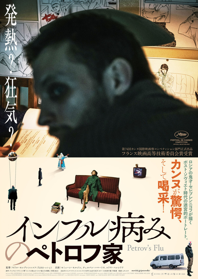 また、併せて解禁となったポスタービジュアルでは、「発熱?狂気?」というキャッチコピーと共に、主人公ペトロフが異常な表情で振り返る謎めいたショットが使われている。その下には、ソファーに座る妻ペトロワ、UFOに吊られた人物、ロシア版サンタクロースや謎の仮面の男など、印象的でどこか奇妙なモチーフが散りばめられている。