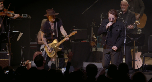 併せて解禁となった場面写真では、シェインの還暦パーティーでギターを弾くジョニーと、ロックバンド「U2」のボーカリスト、ボノが歌う様子が切り取られている。