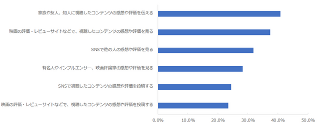 該当の動画配信サービスで動画のコンテンツを視聴した後に取っている行動について調査したところ、「家族や友人、知人に視聴したコンテンツの感想や評価を伝える」が最も多く40.9%となった。次いで「映画の評価・レビューサイトなどで、視聴したコンテンツの感想や評価を見る」(37.4%)、「SNSで他の人や感想や評価を見る」(31.9%)が続いた。