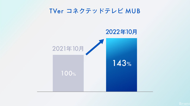 TVerでは2019年4月よりコネクテッドTV(以下、CTV)へ対応を開始し、対応端末の拡充はもとより、各端末のリモコンにワンボタンでTVerにアクセスできるアクセスボタンを設置するなど、利便性の向上に取り組んでおり、2022年10月のTVerにおけるCTVのMUBは前年同月比で143%と大きく伸長している。