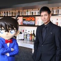 今回、組織メンバーのコードネームの由来となっているオリジナルボトルを用意し、大人な雰囲気溢れるバーカウンターでコナンと対面。声優はゲームソフト「龍が如く4 伝説を継ぐもの」以来、約13年ぶりということで、「プレッシャーが大きかったです。お正月からずっと緊張したままアフレコに臨みましたが、現場ではコナン君の世界観に自分が入り込んだ感覚を味わえて楽しかった」とコメント。今作の魅力について「アクションやスリルにドキドキするだけでなく、色んな意味のドキドキが詰まった作品になっています!」とラブコメ要素についても目を輝かせながら語った。