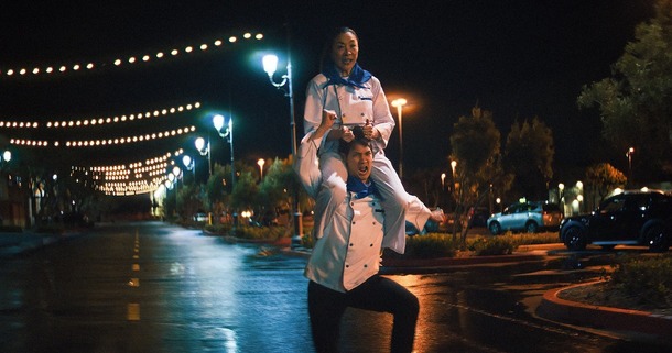 エヴリンがマルチバースに迷い込み、割れた鏡に映るように“別次元の自分”を垣間見混乱する姿、カンフーの達人である別の平行世界にいる<エヴリン>の力を得て小指で筋トレに励む姿、なぜかシェフになって肩車ダッシュする姿など、奇天烈なマルチバースの世界で彼女が救世主(?)の力に目覚めていく様子が捉えられている。