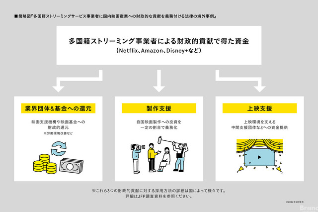 こうした、諸問題に対応するためには、必ず予算の問題がついてまわる。JFPは、海外の事例としてNetflixなどの多国籍ストリーミングに財政的貢献を求める法の導入が進んでいることを紹介している。