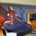 同客室は、アイアンマンのアートがあふれたスペシャルルーム。客室に入ってまず目を引く迫力満点のミューラルアート(壁画)をはじめ、主人公トニー・スタークが歴代のパワードスーツに囲まれたシーンが描かれている壁掛けのアートがゲストを出迎える。いまにも動き出しそうにダイナミックなポーズをとるアイアンマンと一緒に写真撮影も楽しめそうだ。