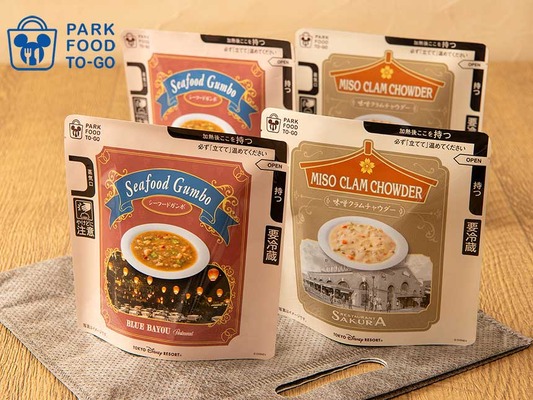 パークで親しまれている人気のあのメニューを、おうちでも楽しめる形で登場する同シリーズ。5月発売になり話題を集めた「ミッキーロングパン(塩バター味)」(1,300円)に続いて「スープセット(シーフードガンボ×2袋、味噌クラムチャウダー×2袋)」(3,000円)が新たに登場する。