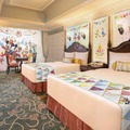 カーテンやヘッドボード上部には、ディズニーキャラクターたちが描かれ、40周年をお祝いする特別なデザインに。ベッドスローにはガーランドのモチーフとともに、様々なディズニーキャラクターなどがあしらわれており、祝祭感あふれる雰囲気を楽しめるようになっている。