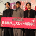 映画『劇場版 君と世界が終わる日に FINAL』公開記念舞台挨拶が2月7日(水)に都内劇場にて行われ、主演の竹内涼真、主題歌を担当し、さらに本編内とある重要なシーンに出演している菅田将暉が菅原伸太郎監督とともに登壇。「久々の共演」と言い合う二人の貴重な朋友トークが交わされただけでなく、竹内さんが客席の観客に“逆質問”をしたり、菅田さんが突如現れたゴーレムに笑顔を教えたりと、盛りだくさんな舞台挨拶となった。