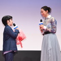「僕のお母さんになってくれて、ありがとう」と感謝を伝えながら中須さんが花束を手渡すと、杏さんは満面の笑みでハグ。「このセリフは、映画を観るとWで泣けてきますね。あとでしっかりかみしめたいです…!ありがとうございます」と感激していた。