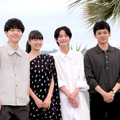 カンヌの清々しい青空をバックに、温かみがありながら明るさも感じる「エルメス(HERMES)」のグレイッシュな半袖シャツとカジュアルシックなカーキパンツに身を包んだ奥山監督。同じく「エルメス」の濃いグレイの長袖ポロシャツにブラックのタック入りパンツ、そして腕にはエレガントなレザーベルトの「カルティエ(Cartier)」の時計を着用した池松さん、「ヴァレンティノ(VALENTINO)」の真っ白なシャツ風のつなぎというユニークでフレッシュな装いの越山さん、柔かな素材にドットがプリントされた可憐なドレスを身に着けた中西さんらが笑顔でフォトコールに登場。