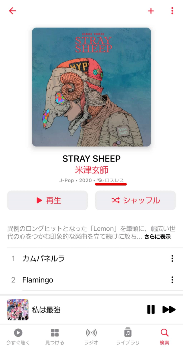 ロスレスに対応している場合、アーティスト名の下に「ロスレス」と表記されています。