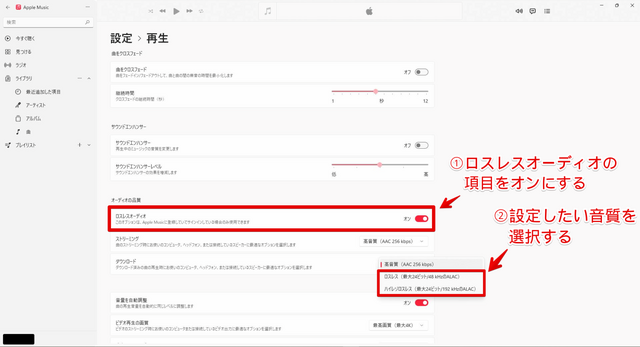 オーディオの品質の欄にある「ロスレスオーディオ」にチェックを入れる