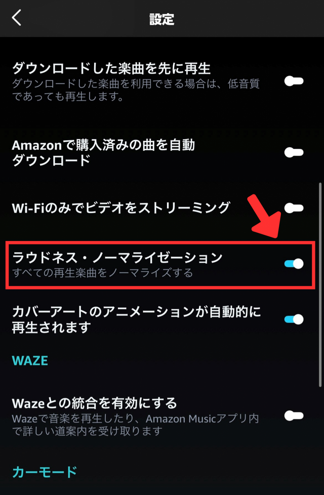 ラウドネス・ノーマライゼーションとは、曲ごとの音量差を減らして聴きやすくする設定です。