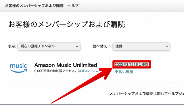 確認方法ですが、「メンバーシップおよび購読」から更新日の確認ができます。