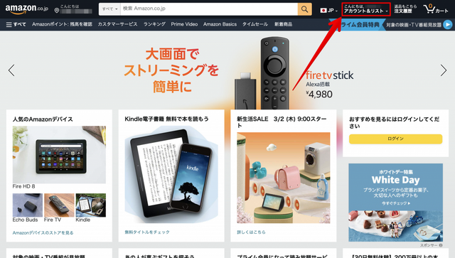 まずはAmazonのWebサイトにアクセスし、ログインして下さい。