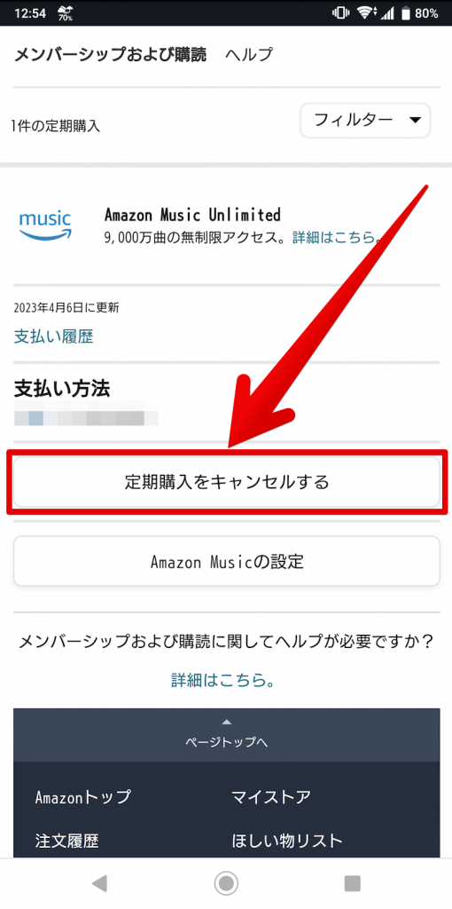 この画面で、Amazon Music Unlimitedの枠にある「定期購入をキャンセル」をタップします。