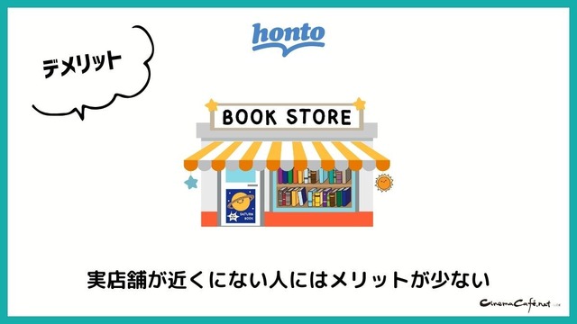 実店舗が近くにない人にとっては、hontoはメリットが少ないといえるでしょう。