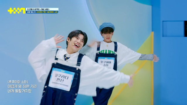 日本人練習生の16歳・サクラダ ケンシンと17歳・フクヤマ ソウタは、デニムのオーバーオールを着て登場。ほかの参加者たちからも「かわいい」と思わず声が上がる。