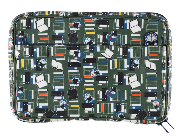 「PCケース 本読みドラえもん」は収納可能なハンドル付きで、持ち運びにも便利なPCケースだ。外側の片面と内側には収納ポケットを設けており、パソコン以外にも小物類を合わせて持ち運べる。ブックカバー、ミニトートバッグと共通の生地を使用しているため、汚れや水濡れに強い仕様となっている。