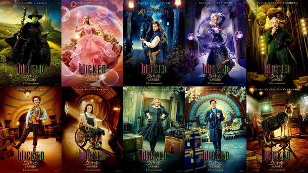 全米初登場No.1の記録的大ヒットスタートを切った、不朽のミュージカルの映画化『ウィキッド ふたりの魔女』から、幻想的なウィキッドの世界へと誘う色鮮やかなキャラクタービジュアル全10種が解禁された。