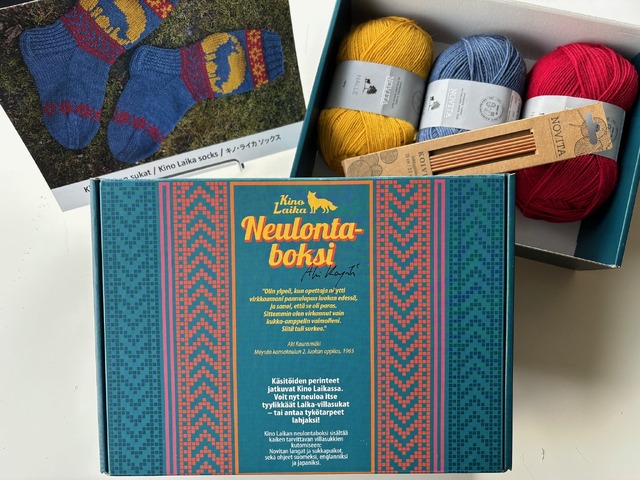 キノ・ライカから届いたのは、ロゴ入りTシャツ、パーカー、キャップ、オリジナルのポスター、そして「キノ・ライカ 二ッティング・ボックス/キノ・ライカ ソックス」。3色の毛糸と編み棒、編み方説明書(フィンランド語・英語・日本語)が入っており、説明書通りに編み上げるとキノ・ライカのロゴ入りソックスを完成させられるというユニークな一品。