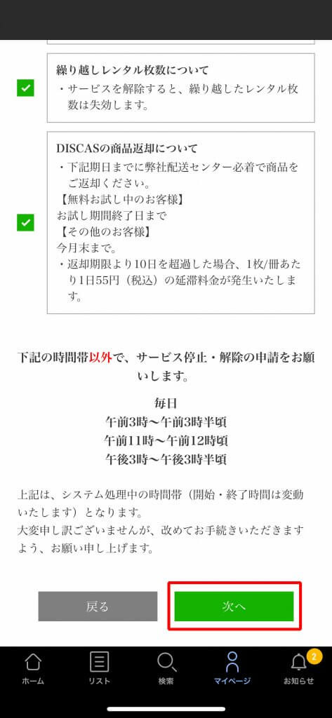 解約に関する注意事項が記載されているので、左のチェックマークをタップしましょう。