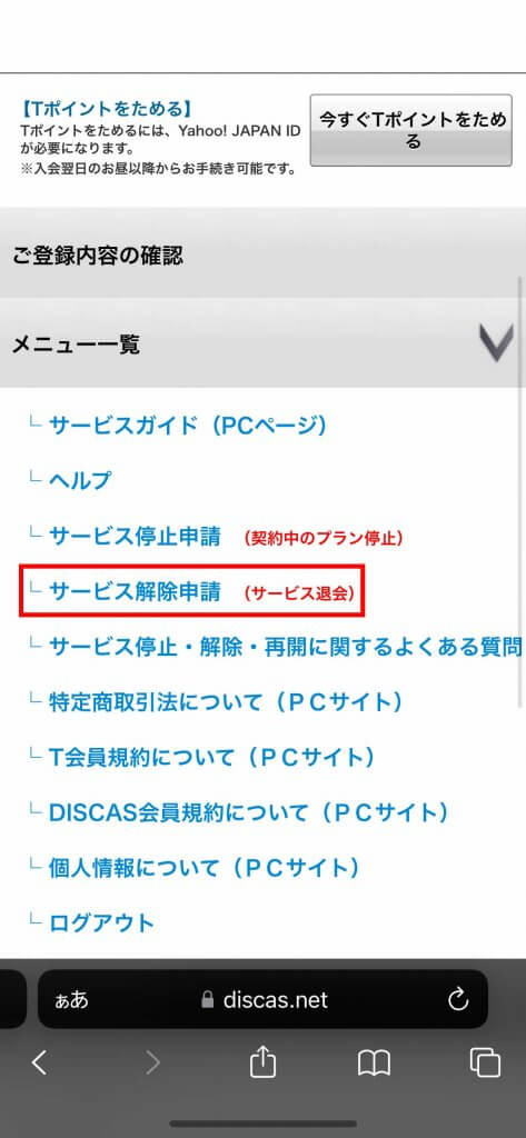 そのまま下にスクロールしていくと「サービス解除申請」という文言が現れます。