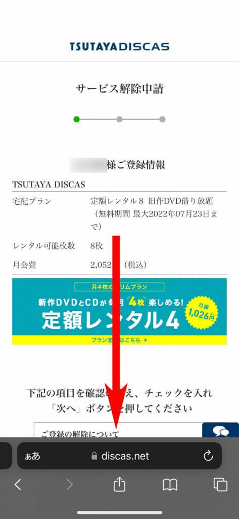 ページが遷移して「サービス解除申請」と表示されたら、下までスクロールします。
