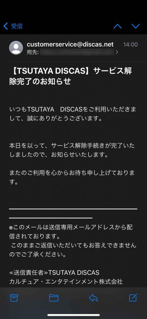 ツタヤディスカスを解約すると、登録時に使っていたメールアドレス宛に解約完了メールが届きます。