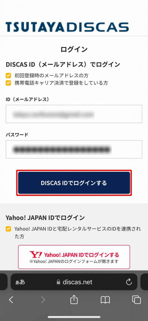 ツタヤディスカスの登録に使っていたメールアドレス・パスワードを入力し「DISCAS IDでログインする」ボタンをタップします。