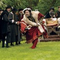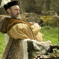 目を閉じたヘンリーが、妻であるキャサリンの口を閉ざしている。見たいものしか見ないヘンリーと、言いたいことを力づくで抑え込まれるキャサリンを表現するかのようなカット。豪華絢爛な衣装や美術にも注目だ。