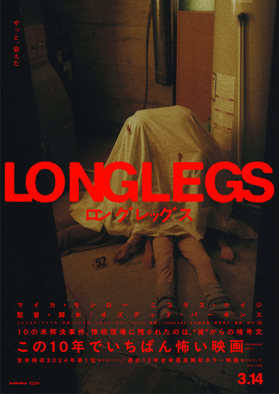 さらに、今まで全貌が明らかとなっていなかった、「ロングレッグス」の姿を一部捉えたメインビジュアルも解禁。青白い顔面に、狂気じみた視線をこちらに向けた姿は、極めて異質。戦慄を誘うビジュアルとなっている。