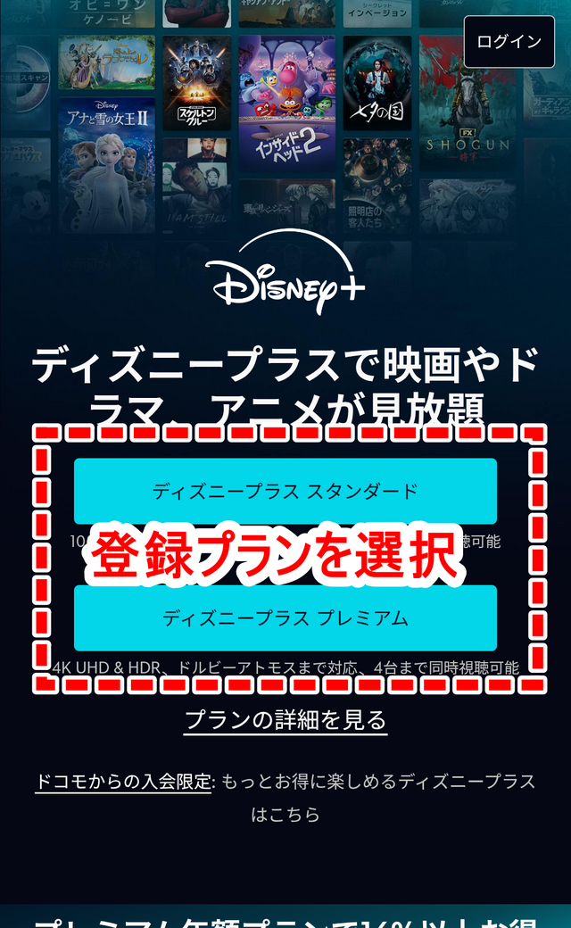 ディズニープラス公式サイトにアクセスし、「登録プラン」を選択します。