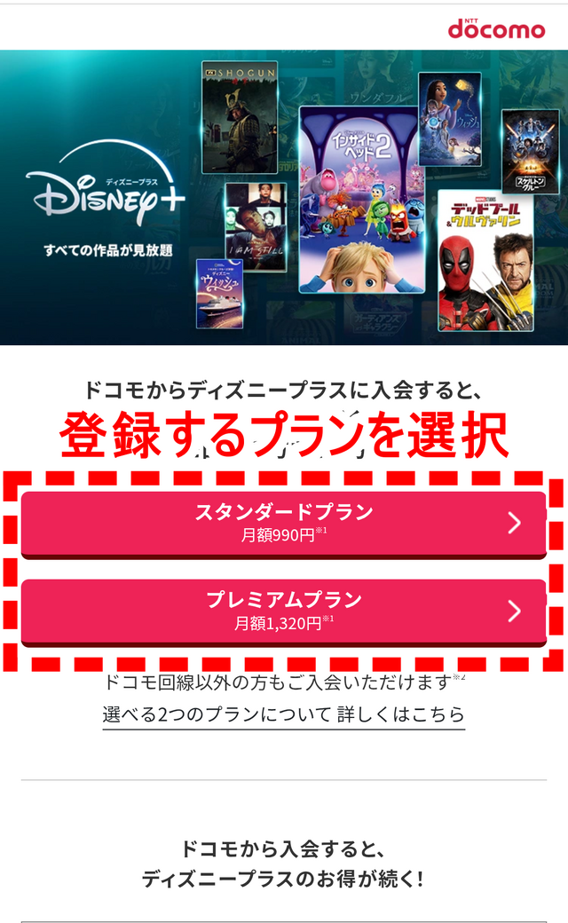 ドコモのキャンペーンサイトにアクセスし、スタンダードプランまたはプレミアムプランを選択します。