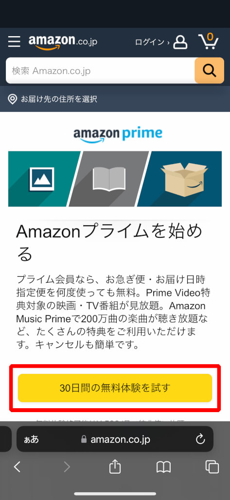 Amazonプライムビデオの無料体験の申込方法は有料会員の登録と全く同じです。