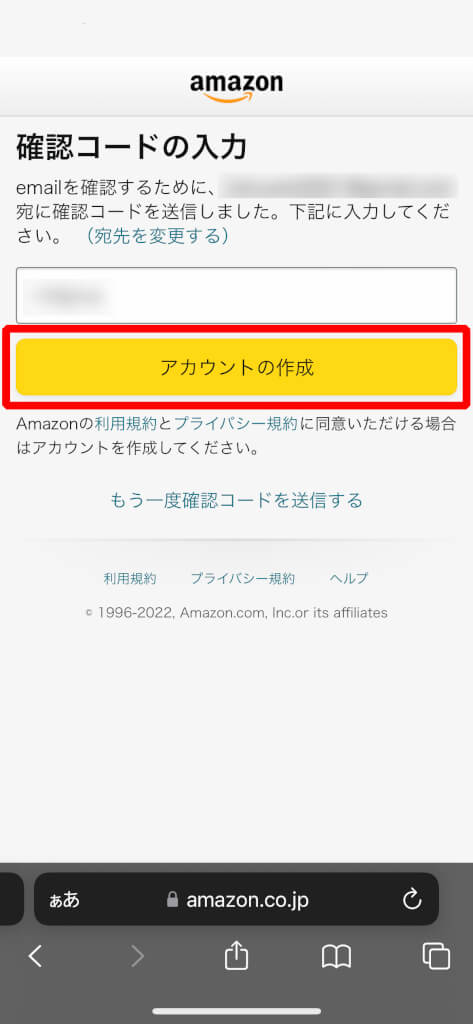 再びブラウザに戻り、メール画面でコピーした6桁の確認コードを入力し「アカウントの作成」と書かれているボタンをタップしましょう。
