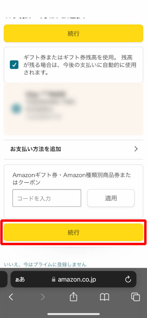 クレジットカード情報がしっかり入力されていることを確認したら、画面下部の「続行」と書かれているボタンをタップしましょう。