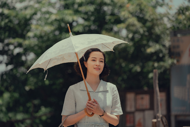 また綺麗な和服を装い、出先で何かを気にするかの様に上に眼差しを向ける悦子の姿や、街で日傘をさし幸せそうに微笑むカット。