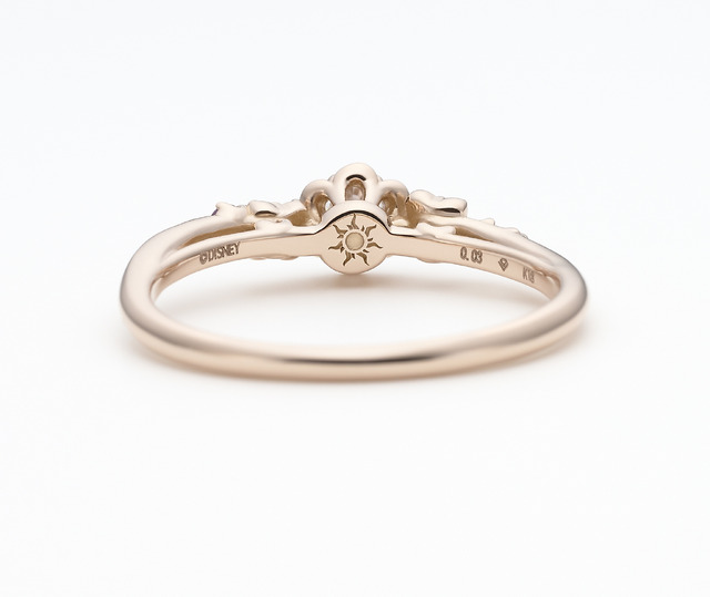 光に導かれて、初めて外の世界へ飛び出したラプンツェル。髪を結ってもらい小花で飾り付けをしたラプンツェルは、ユージーンと町で楽しい時を過ごす。ラプンツェルの可憐な三つ編みヘアに散りばめられた小花をリング全体で繊細に表現した5th限定デザイン。石座裏には、ストーリーの中でも象徴的なモチーフである「太陽の紋章」が刻印されてる。