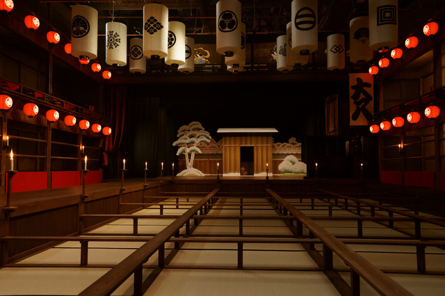 また300人規模の観客を収容できる芝居小屋を撮影所内に再現するという試みも、本作の大きな挑戦のひとつだった。過去にNHKドラマ「忠臣蔵 No.5 中村仲蔵 出世階段」で江戸三座の中村座を再現した経験を踏まえ、「当時は舞台と楽屋裏を一体的に作ることにこだわりすぎて、間口、奥行き共に若干の狭さを感じた。この経験を活かし、劇場は劇場、舞台裏は舞台裏として作ったのが功を奏し、立ち回りに十分な舞台スペースを確保できた。花道も江戸時代のものとほぼ同じ長さを確保できた」と振り返っている。その結果、舞台上の迫力と舞台裏の気配が無理なくつながる空間が立ち上がり、芝居の臨場感を支えた。
