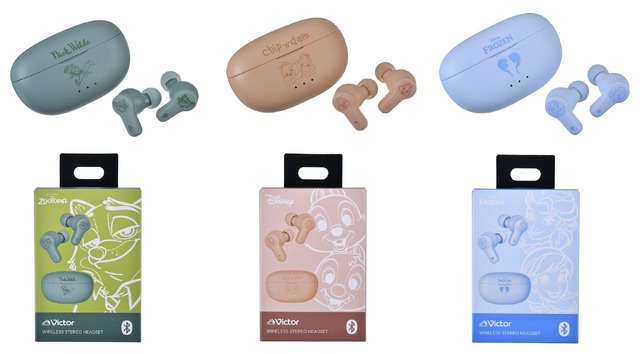ディズニーストアとVictorの共同企画による、ディズニーキャラクターの完全ワイヤレスイヤホンが発売される。
