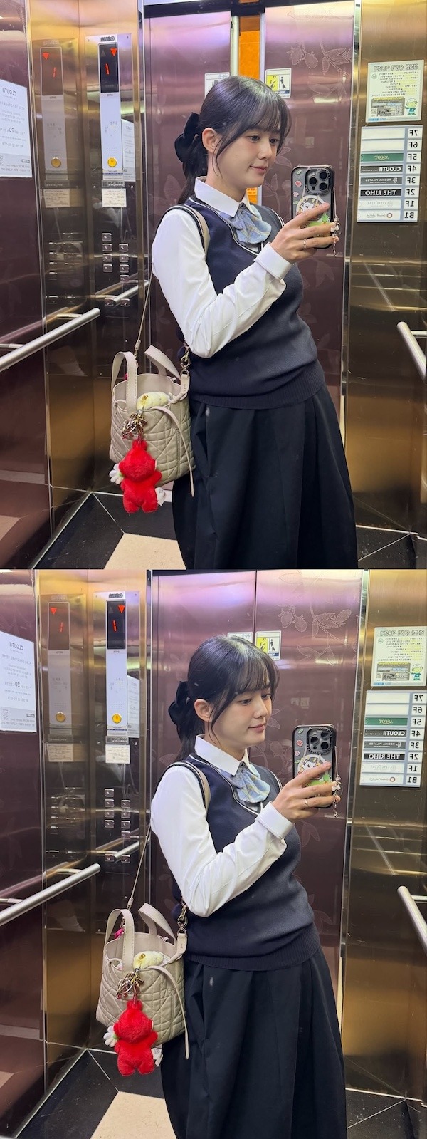 写真に写っているのは、清楚な制服姿のままエレベーターの中で鏡越しに自撮りをするナム・ボラの姿。特に視線を集めるのは、制服の下からくっきりと浮かび上がるふっくらとした「Dライン」だ。