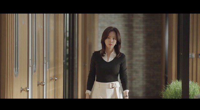 CEOカン・ジユンのファッションは、白と黒のコントラストを効かせたストイックなスタイルや、ときには落ち着いたピンクベージュなど、肌馴染みの良いニュアンスカラーをボトムスに取り入るなど、冷徹さの中にわずかな「人間味」や「柔らかさ」を滲ませるコーディネート。さらに洗練された“くびれヘア”が軽やかさをプラスしている。