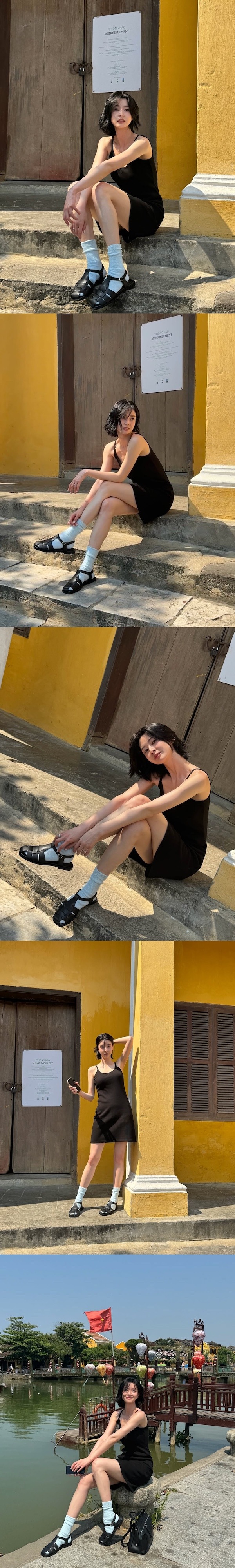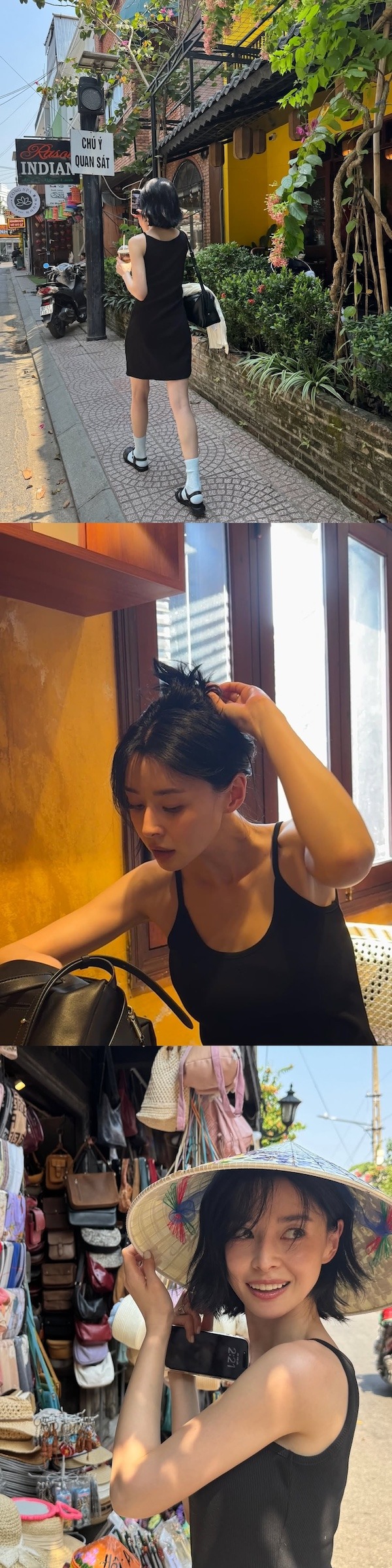 それらの写真には、ベトナム・ダナンを訪れ、リラックスした時間を過ごすクォン・ナラの姿が写っている。階段に座って日差しを浴びたり、市場を見て回る姿など、自然体の魅力が印象的だ。