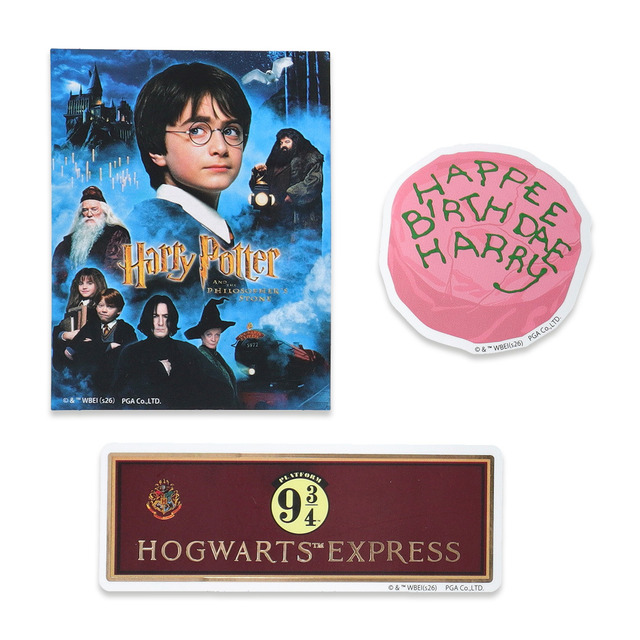 映画『ハリー・ポッターと賢者の石』のメインビジュアルと9と3/4番線の看板、ハグリッドがハリーへ贈ったバースデーケーキのダイカットのステッカー3枚セット。耐水・耐光仕様で、パソコンに貼ったりスマートフォンの裏に挟んだりして使える。(価格:税込990円)