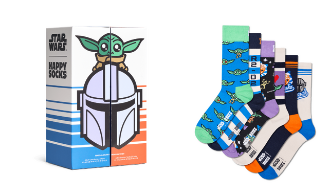 特別な日の贈り物にふさわしいギフトセットは、開ける瞬間のワクワクまでデザインされている。3足セットはマンダロリアンやグローグー、R2-D2など主要キャラクターの魅力を凝縮。