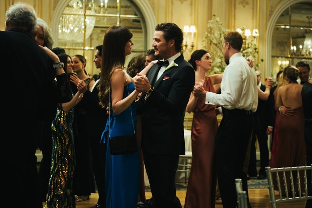 物語が動き出す特別なシーンでは、華やかなドレス姿も披露される。自身がマッチングさせたカップルの結婚式では鮮やかなロイヤルブルーのベアトップドレスという装い。その場でジョン(クリス・エヴァンス)との再会とハリー(ペドロ・パスカル)との出会いが重なり、彼女の人生は急展開を迎える。
