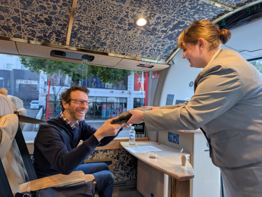 神姫バスではこだわりのある上質な旅、「真結(ゆい)ツアー」を企画しており、2024年からはインバウンド向けのツアー展開もしております。特別車両「YUI PRIMA OLIVIA」は、世界的工業デザイナー水戸岡鋭治氏が手掛け、大型バスでありながら21席のゆとりある座席配置で快適な移動環境を実現しています。英語対応可能な専属のアテンダントスタッフによる車内での無料ドリンクサービス(アルコールを含む)や言語サポートを通じて、「移動時間そのものを旅のハイライト」と感じていただけるよう上質な旅をご準備しております。