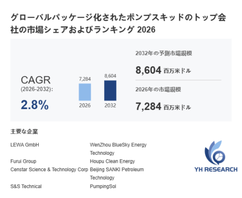 YHResearch調査チームの最新レポート「グローバルパッケージ化されたポンプスキッドのトップ会社の市場シェアおよびランキング 2026」によると、2026年の7284百万米ドルから2032年には8604百万米ドルに成長し、2026年から2032年の間にCAGRは2.8%になると予測されています。