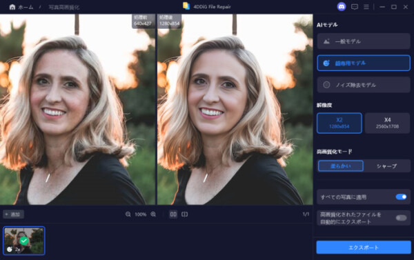 手順3.AIモデルを選択し、解像度を調整した後、「今すぐ高画質化」ボタンをクリックすると、ソフトウェアが高画質化を開始します。高画質化処理が完了したら、プレビューで元の写真と高画質化された写真を比較します。